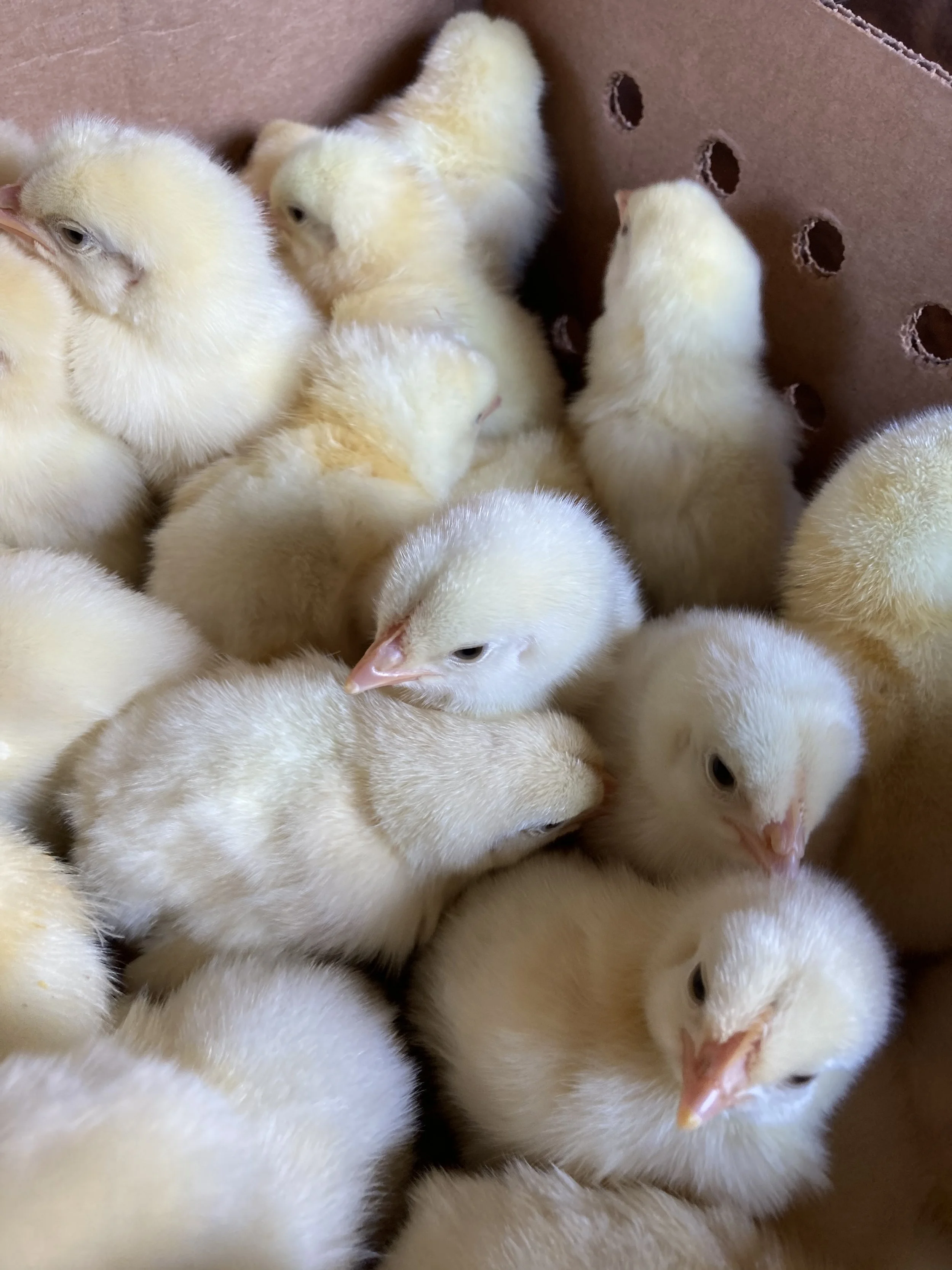 It is amazing to watch them running, eating, and drinking within seconds of being taken out of the box! They will need a room temperature of about 70 and a brooder of about 95 for the first week. After that we begin to slowly turn down the temperatures and “harden off” the chicks so they are ready go out onto pasture at 3 weeks.